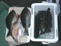 クロとマダイ (まつき釣具本店にて) どちらも綺麗な 魚体で私を喜ばせてくれた |