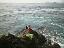 □船間に2人…上げ潮に苦戦。当然だが下げ潮ポイントのつらいところで有る。それなのに、速見の10時見回りで瀬替わりして行ってしまった、大いに疑問で有る?????。 その後、テルの客2人が渡礁。昼から下げ潮になってヒット仕始めた。所が…先端の1人が連続バラシを演じて、見た限りでは逮捕数は僅かであった様だ。潮が早くなった2時過ぎから竿を置き、我々の釣りを見ていた…勿体無い事を。当番瀬で細仕掛けは禁物ですヨ!
