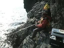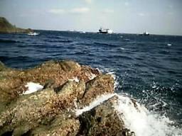 突端のハナレ 道具を下ろして、コマセを作り、仕掛けを…。 だが、時々突風が吹き付け、シブキが掛る。 これから満ち込み、さあどうする? ボスがギブアップした。体温が下がり過ぎて危険だ。 止む無く船長に電話をして瀬替わりをお願いした。 |