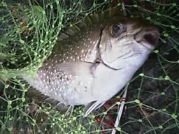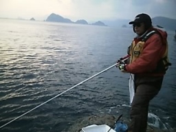 潮が良くならないまま4時半になり、最後の一投を沖の潮目に投入して、コマセをタップリかぶせてどんどん流した…やはり左へ曲り、瀬際に沿ってナガウド方向に流れて行った。暫くして当たりを捕らえたが、難無く手前に寄せてきたら…???アレレー??? モノが違う。顔を出したのはバリだった。ガックリ!