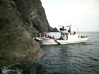 さて、昼前、磯周りには小魚が一杯、餌盗りのキタマクラも元気だった。ボスに4番向きの本命ポイントに入ってもらい、引かれ潮に乗せて沖の潮目を狙って下さいとアドバイスして、私は中央の釣り座で始めた。手前は餌さ盗り、沖目は当たり無し…暫くして右手に釣り座を移動して、サラシの先から流し込んで見た。そこで始めてクロの当たりを捕らえる事が出来た。ヒラセの沖側ではデカイのがバシャバシャ…噂のナブラだ。沖目に棚を浅くして仕掛けを入れ、コマセで誘って見たが、ノーヒットだった。