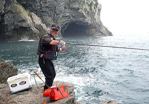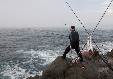 今回は大潮の最後から中潮、まだウネリが残っていた。潮位が高く、満潮時には高い釣り座ギリギリまで波が上り、後ろの崖下を海水が流れたることもしばしあった。