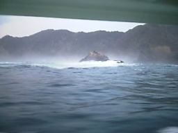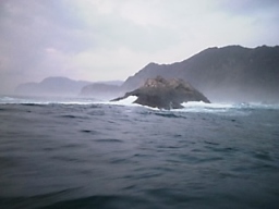 海上は波長の長いウネリが有り、不気味に各磯を舐めて居る。大島側をユックリ北上して上がれそうな場所を探す。オオバエの沖側を廻って行った。やがて我々は恐怖の光景を目撃することに…・(写真参照)
