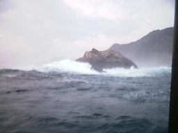 オオバエ‐@ これは、クジラ浜ではなく、オオバエですが、 うねりの波に半分沈んで居ます。 ここからは見えませんが、コバエも完全に 波を被っていました。 |
