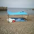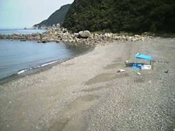 〇右側: 我々の簡易日除けテントとクーラー *我輩はここで泳いだ。 *向こうの岩場で釣りをしていた若いカップルが 昼頃戻って来た。釣れましたか?と尋ねたら、バリ (アイゴ)1匹だけでしたと元気無く答えて帰って行った。 *師匠と2人で昼食を食べて、昼寝していたら、 クラブ員のE氏が子供を連れて遊びに来た。しかし、 彼等は小1時間ほど遊んで帰ってしまった。 そして、他に誰も居なくなった。 |