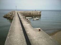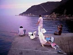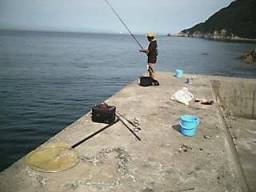 〇波止場全景 *午後4時ころから師匠は竿出し… アジゴ、生まれたばかりのマダイの子、ベラ、ハコフグ、 カワハギ、メバルなどがコマセにワッと群がる。 |