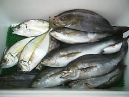釣果です イサキ(イサギ)とヒラアジ だが、どう見ても幼児虐待 苦労して釣ったんだから、ご勘弁を! これは、家内が好きな魚なので、お土産にしました。 |