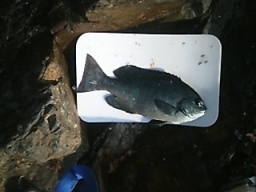 クチブーゲット 2日目朝、パン粉釣法でゲットしたクチブー。 撮影後、放流しました。 この時期のクロ(メジナ、グレ)は、持ち帰らない事にしています。 (40aオーバーだったら、1匹は持ちかえるかも?笑) |