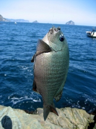 竿1.5-53、道糸2号、ハリス1.5号、グレバリ4号、ウキG2-M、棚2ヒロ。コマセを払い出しの先と岩の先の水道からの流れがぶつかるあたりをポイントに定めて手前からコマセを打ち、仕掛けを投入してから少し手前に引いてから仕掛けを馴染ませる。一投目からウキがピューっと入った。軽くピュっと合わせてやるとキューンキュンキュンと、コッパグレが掛って来た。