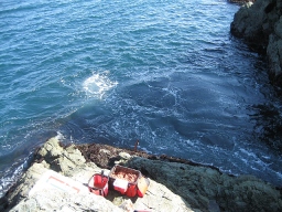 11時頃、北風は可成り強く吹き始め、白波が立ち少しウネリが出始めた。これから下げ潮だからさして危険は無いだろうが、飛沫が掛り始めたので、道具を一段高い岩影に移動し、潮の変化を観察した。