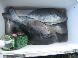 エっ、何で???タナを少し浅くして、もう一度同じ様に流して見る…今度はウキがスーっと沈んで行った。そんなこんで潮目を狙って釣りが続き、レギュラーサイズのクチブーとオナガまじりで暫らく釣った。