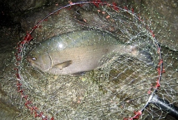 数投目に待望のアタリが出た。しっかりと重量感のある引きで竿に乗って来た。彼奴はギュンギュン足元に突っ込みを見せる、しかし我輩の軍門に下り、タモに収まった。問題は彼奴が何モノか?と言う事だが・・・・。50cmを遥かに超えたイズスミ君であった。ムムムー、“コイツがオナガグレだったら、自己記録更新出来るのに”っと思いつつカメラに収めてから釈放して上げました。