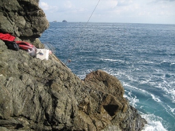 昼頃には潮が高く、ウネリが大きく且つ潮が速くなり、釣り座に波がかぶりだしたので、危険を感じて釣り座を左の高い場所に移動してから、休憩して昼食とした。