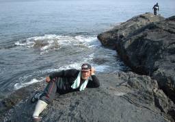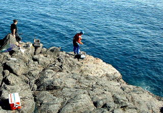 釣り始めて1時間、朝日が眩しい位置に昇って来た頃、2Bのウキが斜め沖に静かに沈んで行った。フケを取り竿を煽り、しっかり竿に乗せハリ掛りさせながら瀬際に出て、竿を海面まで倒し寄せる(竿を立てると突込みが強くなるが、竿を水平にして引くとグレが横になって寄って来るケースが殆どである)。ドン深の足元に突っ込もうとする奴を竿を沖にあおって交わし、左の張り出し根の下に入ろうとする所を8の字で交わして浮かせ、張り出し根の上のサラシに導いてから一気に抜き上げた。40aオーバーのキープサイズをゲット。直ぐ〆て、血抜きをする。其処でコマセを潮筋に数杯投入しておいてから、ハリを結び直して次を流す…。30a前後の奴は水溜まりに入れておく。そうすると、波をかぶった時適当に逃げて海に帰って行った。
