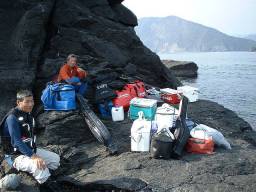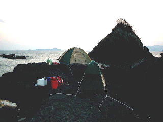 4人、各人の好きな処に場所を決め(テントを張る事を前提に場所を選定)荷物を運び、早速道具を広げて釣りの支度を始めた。