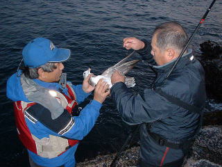 11時、師匠はコマセを撒き終り先に納竿して道具を片付けていた。11時半、私も納竿とした。待っていた神戸の釣人に残ったコマセと付け餌を全部差上げて、下げ潮のポイントと棚、コマセの打ち方の要点をアドバイスして釣り座をお譲りした。嬉しいことに、間も無く良型をヒットさせてヤリトリを始めた。