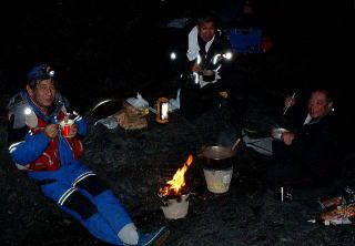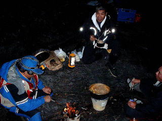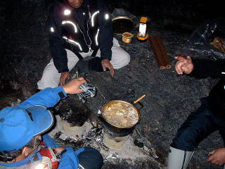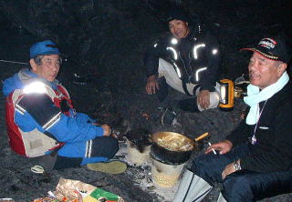 明けて、2004年元旦。未だ暗い5時過ぎ、アラームが鳴る前に目覚めた。心配したエア―ベットはエアー漏れせず、熟睡することが出来た。先ず、アルポットに水を入れて火を付け、沸騰したお湯でカップラーメンとホットコーヒーを作り、朝食をとった。他の3人も起き出し、それぞれ朝食を取る。正月とは思えないほど暖かい朝だった。