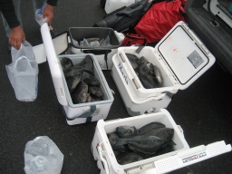 | 3人の釣果(持ち帰り分) 鶴見崎フィッシングで氷を買って… 手前が私のクーラー(釣果)です バッカンにも入っています |