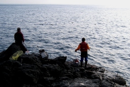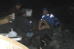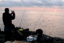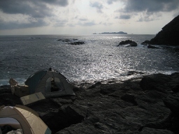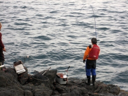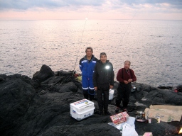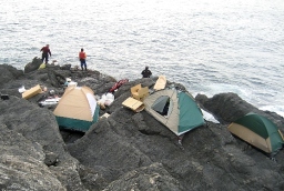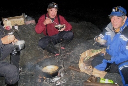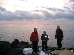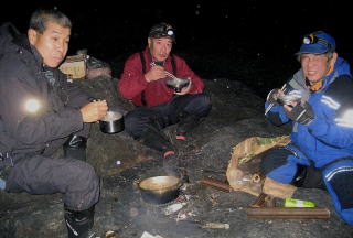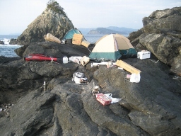 | ■明けて2日、早朝4時過ぎには雨も止み、5時から火をおこして暖を取り、早々に朝食を済ませて、最終日の釣りを楽しんだ。 10時頃には釣り飽きて、片付けを始め、船長に回収をお願いした。 |