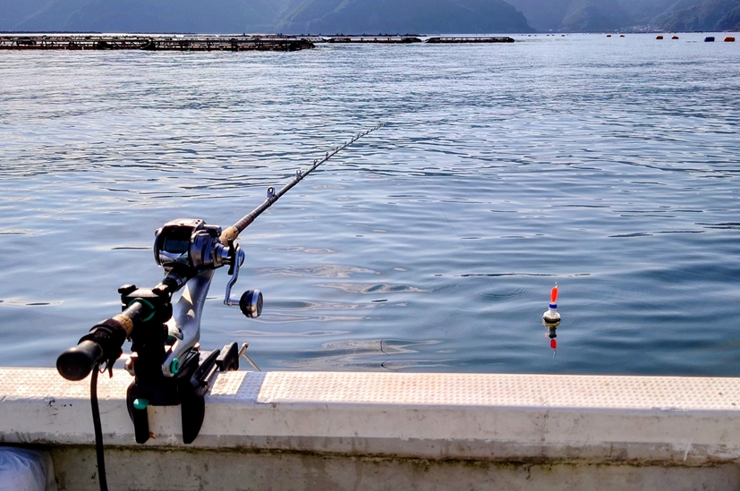 下げ潮に乗ってウキが沖側に流れていた…だが潮が弱い、30メートル…50メートル…沖に潮が抜けて行かない、いつもは沖に向かって仙崎先端方向に抜けて行くのだが、流れは弱く可成り右の浅い方向に流れて行くので、底潮が沖に抜けて行かないので、今日は釣れそうもないと思って居た。