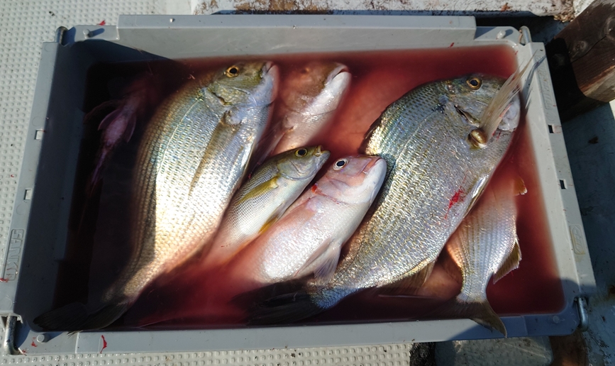 釣った魚はスカリに活かして置き 納竿後生き締め、血抜き |