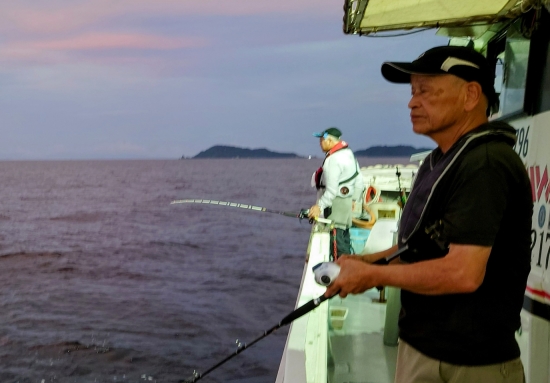 | 今回は近場で釣ると言うので出船は午後6時半 今回は息子さんの第八神幸丸 釣り座は左舷オオドモ |