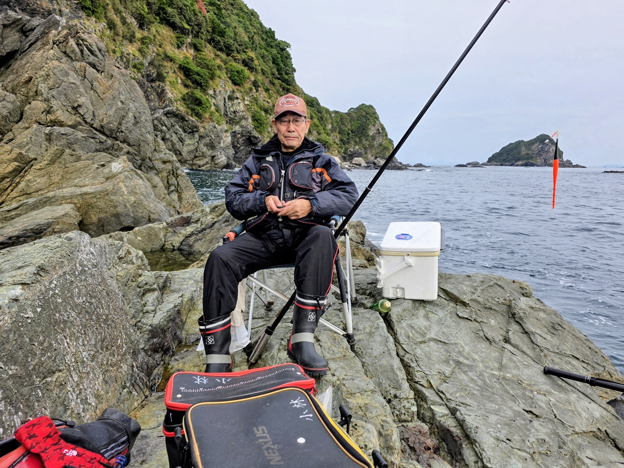 磯の上、平らな場所は少なく足場の悪い箇所が多い *"ウネリが大きくなる予報だから十分波に気を付けて!"と船長に忠告された。 セッティングが終わって一休み 磯での瀬泊り釣行、荷が増えるが椅子は必需品だ |