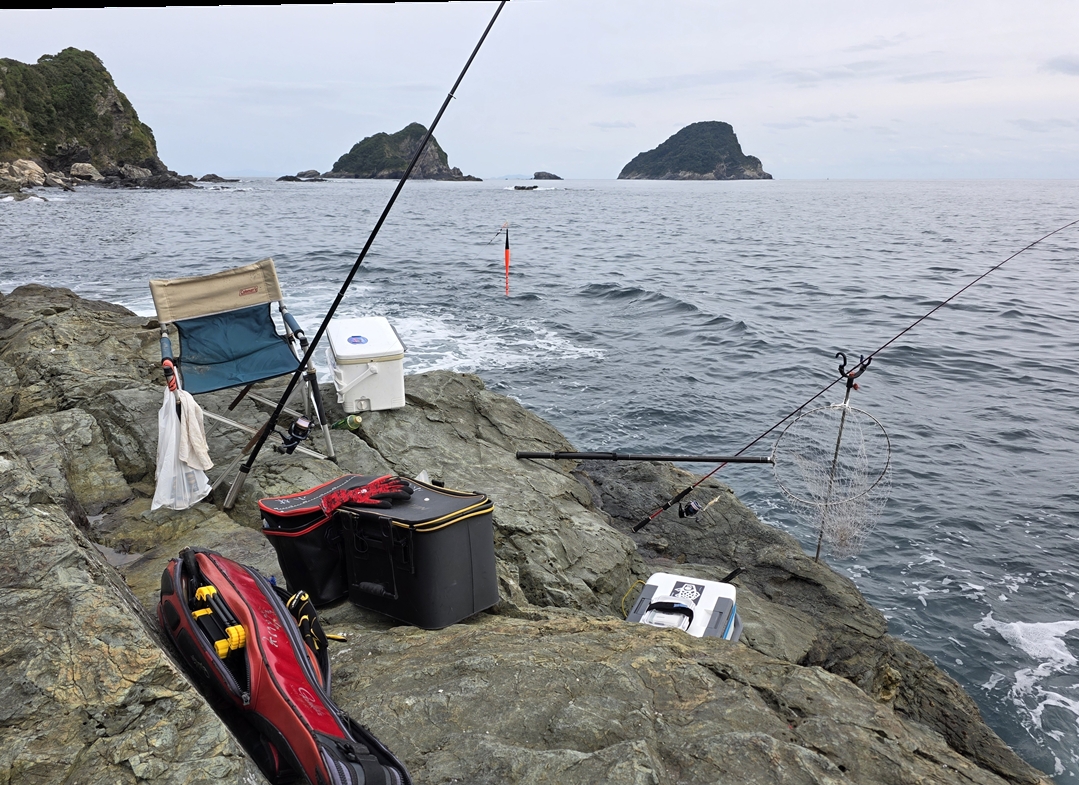 エギング用と泳がせ用の二本 ウネリの払い出しが大きい 日が沈んだ直後、磯の前にクロのナブラが5分程見られました |