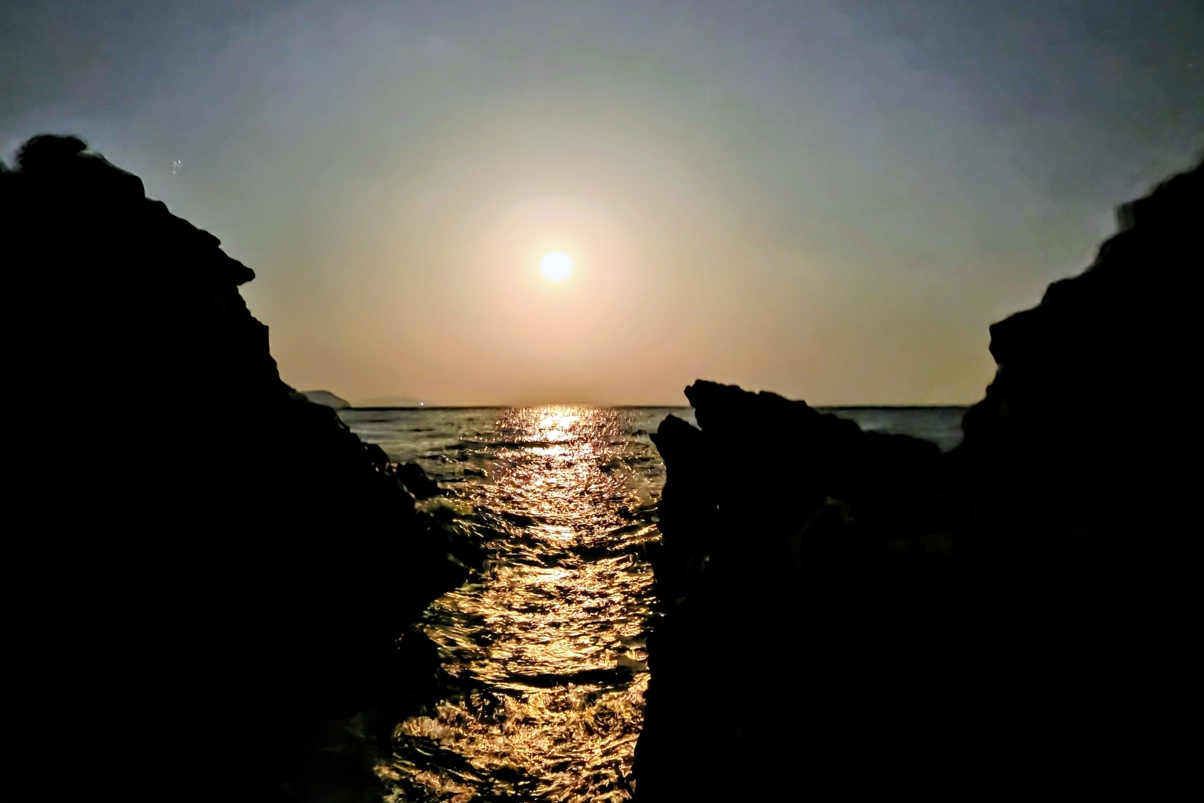 磯の上、平らな場所は少なく足場が悪い 大きな月が昇ってきた |