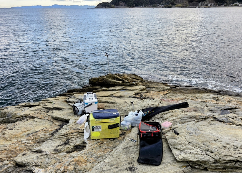 泳がせ餌のアジを釣ってから地磯に行き、道具を運んでから車中で昼食、休憩。