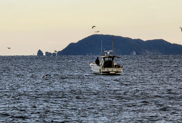 漁師が沖の潮目を流してハマチを釣っていた |