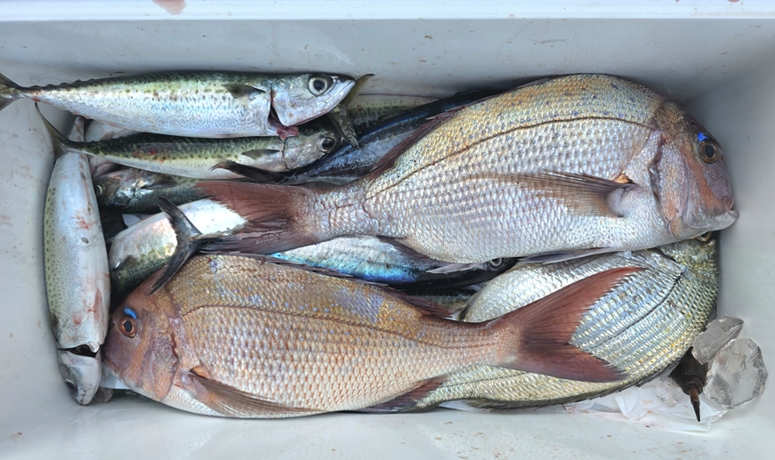 午前中にサバ、カツオ、真鯛、ヘダイ多彩な魚が沢山釣れた。