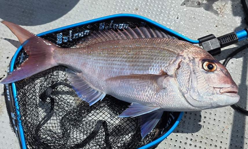 棚を変えたりコマセの撒き方を変化させてサバを交わしているうち、待望の真鯛を釣る事が出来た。