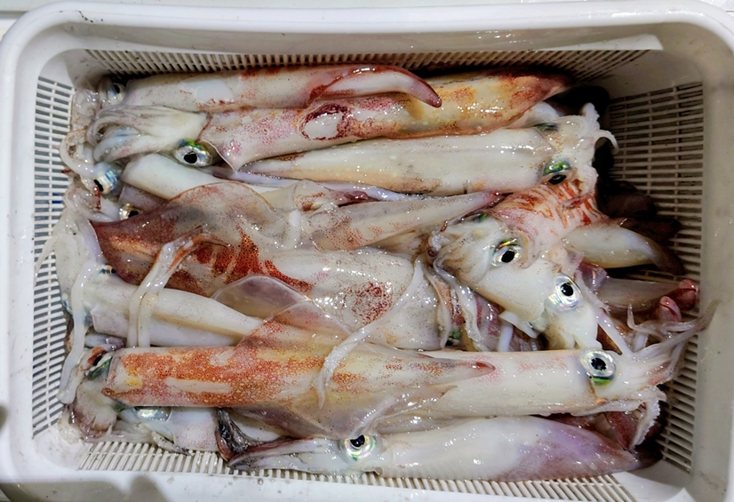 潮が流れ、暫くしてボートの周りにアジの群れが集まって来て、釣り開始早々イカが釣れ始めた。