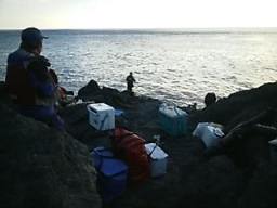 さて、その後の1泊2日の初釣りは、下の写真と添え書きでイメージして頂こう。海はウソの様に静かに元旦を迎え、西よりの風は釣り座後方から吹き、大変釣り易い状況だった。大量の荷物を運んで各自整理してから釣りの準備をする。