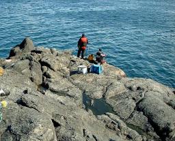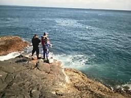 仕切り直しだ、高台で一服した後、東のハナに入った。普段は波が打ち越して凪の日でなければ上がれない釣り座で有る。満ち込みに変り始めたが全体にトロンとした潮の動き。流れが微妙にそして不安定に変化しながら流れたり淀んだりしていた(本流の潮流は、沖のカモメの群がる位置で見当が付く)。